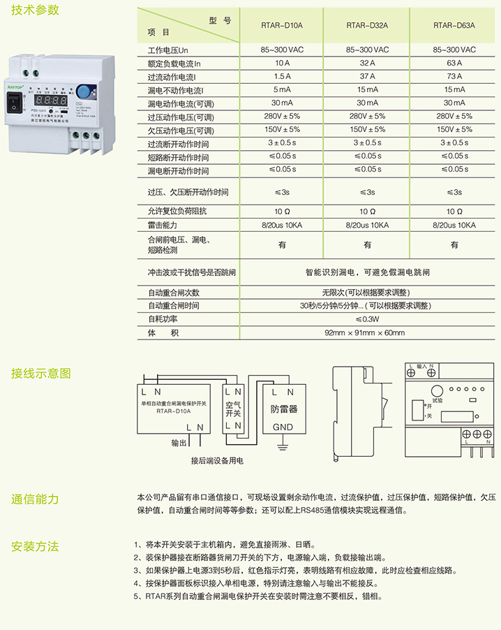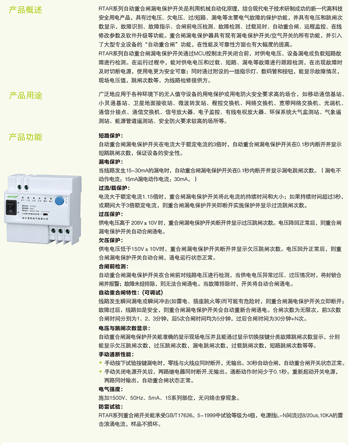 RTAR自动重合闸漏电保护开关